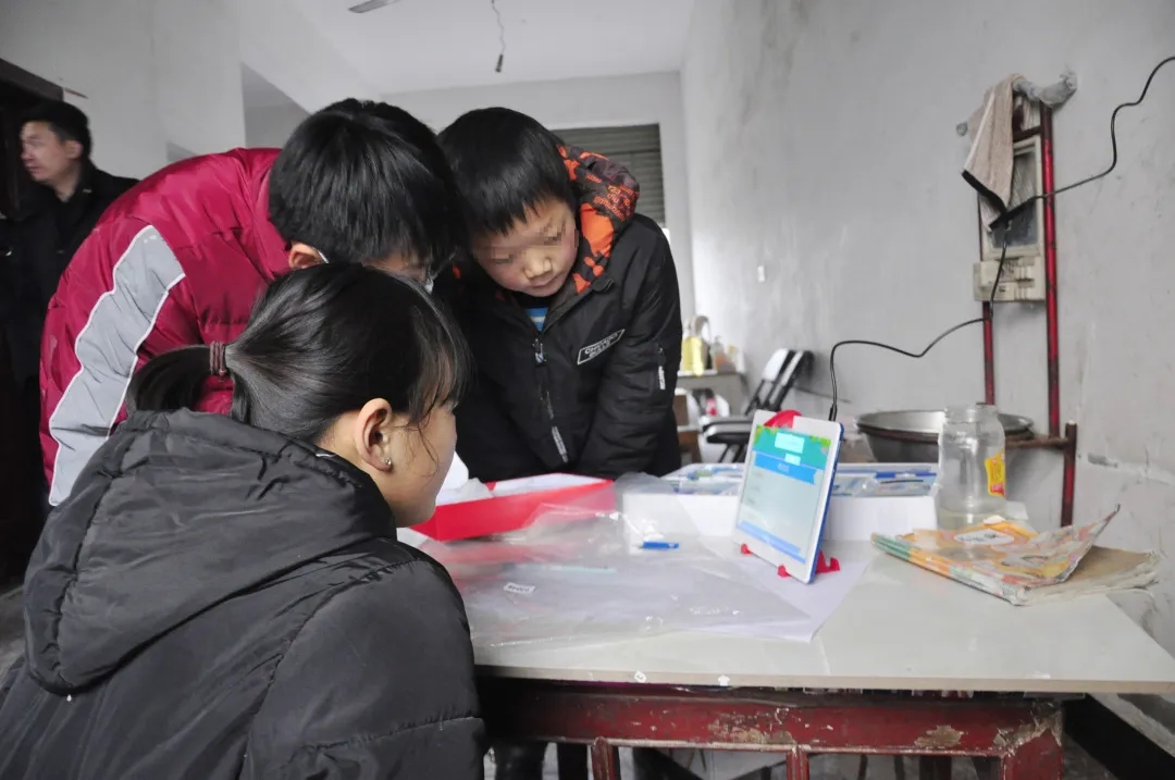 图 | 中环爱心大使任博宇与心怡姐弟研究使用学习机
