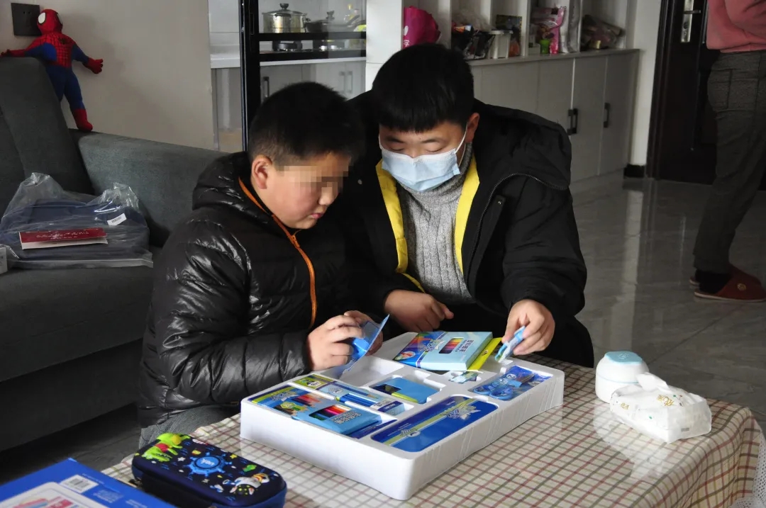 图 | 中环爱心大使谢艾鹏和沫沫一起拆新文具
