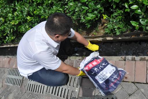 在“中环城·紫荆公馆”小区清理排水沟垃圾