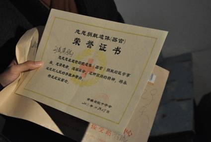 为了给家里的孩子们减轻负担,刘益荣想在自己百年之后将遗体捐献给国家。一开始,小女儿、女婿都坚决不同意,可是,老人却非常坚定。在2011年12月份,刘益荣在志愿捐赠遗体书上签下了自己的名字,“咱不给孩子添负担,到时候,到大蜀山搞个森林葬,挺好的!”