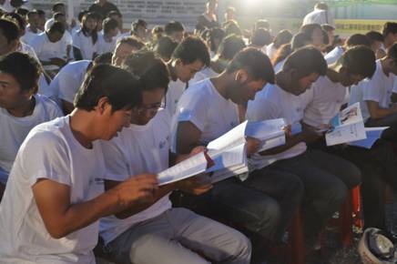 农民工们翻看领到的《学习手册》