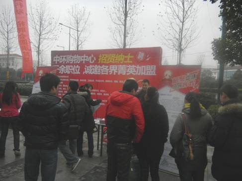 在芙蓉社区委、经开区人才市场和中环商管公司的联合努力下,2012年2月28日上午8:30,经开区芙蓉社区“春风行动”联合招聘会在经开区中环城广场如期举行。本次招聘会是自2009年以来,芙蓉社区招聘活动参与的单位及应聘者人数最多的一次,当天大润发、沃尔玛、海尔、统一、佳通轮胎等一应知名企业进驻招聘会现场,提供岗位涉及到一线操作工、技术人员、销售、电子装配、餐饮等几十个不同种类。中环购物中心行政人事部也整合了商管公司及场内各商家的岗位资源,在服务商家的同时,为求职者提供了大量的工作机会。本次活动的成功组织,不仅提升了中环购物中心的品牌知名度和品牌形象,也充分履行了公司“责任源自内心”的企业核心理念,同时,也为实现我们“立志成为受社会尊重的优秀企业”的企业愿景添砖加瓦。