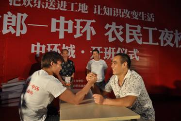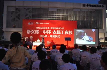 8月15日晚6时,“帮女郎—中环”农民工夜校活动在合肥市经开区中环城项目工地上正式启动。安徽电视台经视频道总监龚正、合肥市城乡建设委员会副主任史先贵、中环投资集团董事长余竹云共同为活动揭牌。在接下来持续一个月的时间内,民工夜校将陆续走进合肥市近十个建筑工地,举行培训讲座、电影放映、趣味游戏等各类活动,为枯燥的建筑工地送去丰富多样的文化大餐。