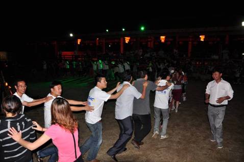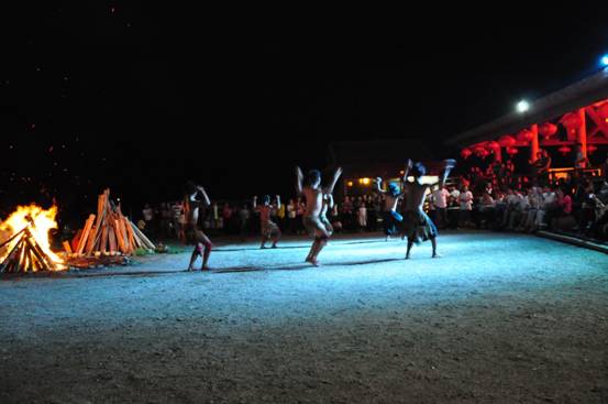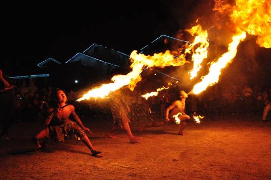 晚餐后伴随着轻快的节奏、热烈的篝火、动感的土人舞蹈,开始了精彩、互动、共参与的篝火晚会。团结舞,所有参与的业主、集团人员,手拉手围着篝火,伴着节奏的鼓点、随着跳动的篝火、跳起了轻快的舞步,此时此刻大家都是团结的朋友,建立了共同的友谊。民族的舞蹈、喷火的表演、吞火的杂技,更是让观众,掌声不断尖叫连连。快节奏的竹竿舞,更是让业主们跳出了节奏、跳出了快乐、跳出了由衷的快意。