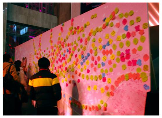 中环购物中心北门厅内,树形的“爱情告白墙”上写满了来往市民的爱情宣言,“老公,永远爱你!”“戒烟戒酒活到100岁,伺候你!”……中庭正中近半人高的圆形舞台,装点得格外温馨。另一边,徽商广播FM100.3的透明直播间也搬到了购物中心,现场播报整个活动过程,徽商广播的明星主播们更是齐现活动现场,与所有参与活动的市民充分互动、联欢。