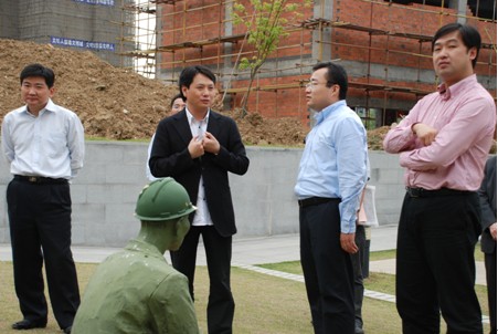 各位领导在中环集团董事长余竹云、党工团办公室主任汪本银的陪同下参观了中环城项目的农民工雕塑广场、农民工学校、农民工图书室和农民工团支部,实地查看了中环城项目团组织工作环境和活动阵地。