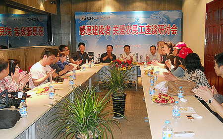 摄影作品参观结束后,当天活动的另一大主题——“感恩建设者,关爱农民工”座谈会在中环艺术馆会议室开始了热烈的讨论。座谈会围绕如何保护农民工权益、如何更好关爱农民工、如何找准切入点,寻求政府政策支持、如何帮助农民工学习文化知识、提升职业技能、更好更快融入城市生活等问题展开了企业、政府、农民工、媒体、公众的多方对话。这样零距离的关注和平等对话对促使关爱帮扶农民工长期持久机制化开展下去有重要意义。