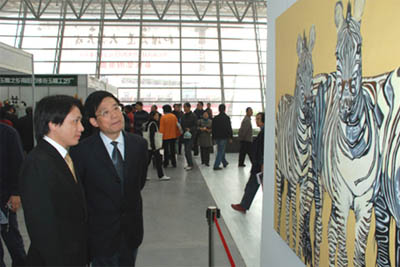 在安徽国际会展中心1.2 万平方米的展场中,中环投资集团的展台显得别具一格,曲折的画廊、雅致的休息区,仿佛把中环艺术馆的将来的艺术策划活动直接搬到文博会的现场。在中环艺术馆前,现代风格的油画、中国传统的水墨画,各种不同的风格和谐共存,引来观众驻足观看,举起手中的相机、手机,留住一幅幅精彩的画面。