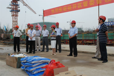 7月15日上午,经济技术开发区管理委员会李平副主任带领区政府一行八人来到我司新项目“中环城” 建筑工地的施工现场,为建筑工人送去一份清凉。安徽中环地产有限公司总经理余竹云先生和总包单位负责人接待了慰问团一行。