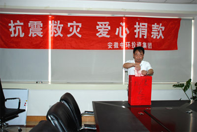 5月20日上午,中环集团举行抗震救灾捐款仪式,集团公司约126名员工发扬"一方有难,八方支持"的精神,纷纷尽自己所能,为四川灾区人民捐款,用爱心帮助区人民重建家园,公司总裁余竹云先生个人捐款拾万元整,短短几日就募得善款拾壹万贰仟零陆拾伍元整,集团公司又捐款拾万元整,到目前为止集团公司及员工共捐助贰拾壹万贰仟零陆拾伍元整。
