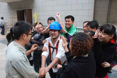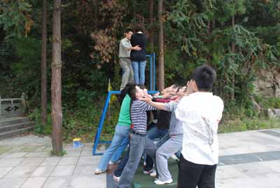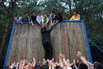 在短短一天的时间里,全体队员进行了信任背摔、空中飞人、梅花朵朵开、穿越沼泽、冲上云霄、毕业墙、穿越大峡谷等项目。在训练中,五个小分队都以自己特色的队名、响亮的口号互相鼓励、团结协作,努力完成每一个项目,训练场上处处可以看到相互搀扶、互相鼓劲的动人场面。队员们打破固有的思维定势,发展创造性思维,使大家的主动性、责任感以及团队意识都得到了充分的展示和升华。
