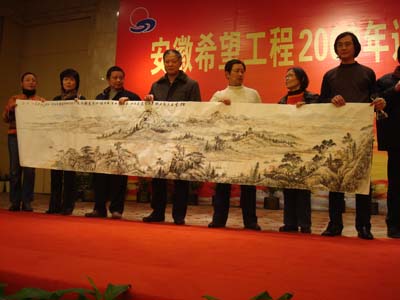 安徽希望工程“迎新春爱心慈善晚宴”活动,已成功举办三届。本次爱心慈善晚宴,共有107家有着良好社会影响的单位和个人应邀出席,44位省内外著名书画家向晚宴捐赠了一百幅精美书画作品。此外,书画家们还现场联袂创作了十米长卷捐赠安徽希望工程。安徽中环投资集团董事长余竹云先生当场决定追加五万元善款收藏十米长卷,这一善举把晚宴现场气氛推向了高潮。