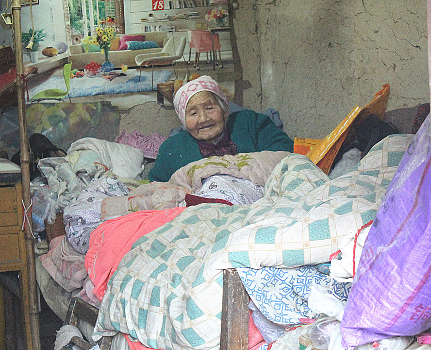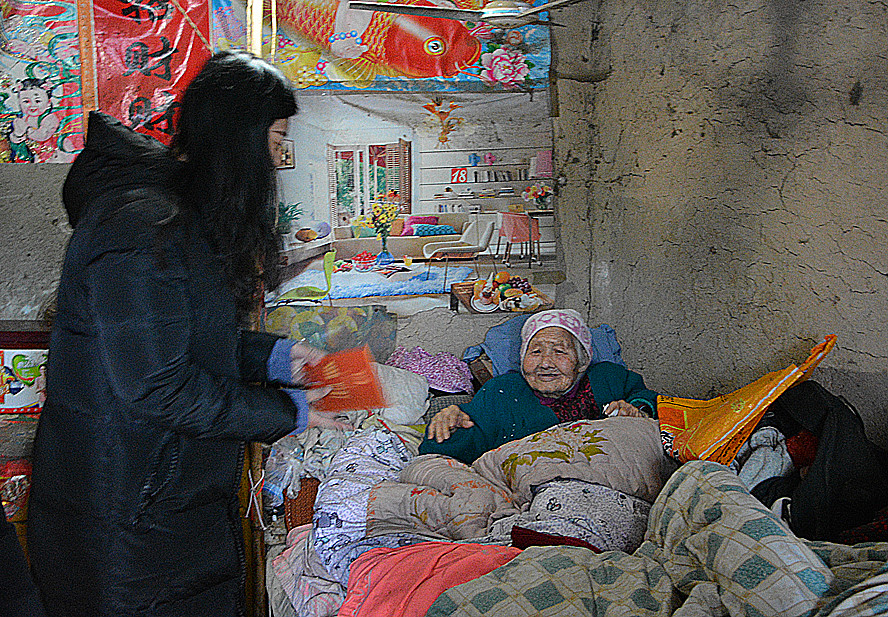据田桥街道办副主任史洪章介绍,目前老人和她年纪已高的儿媳妇住在一起相依为命。但她的儿媳妇患有乳腺癌,同时还伴有长期性的慢性疾病。因此家中没有劳动力,更没有任何劳动收入,婆媳两人依靠政府提供的补助艰难度日。爱心大使们把带来的米面油等生活用品搬进老人的家里,总裁办主任胡诺将慰问金交到百岁老人手中,并叮嘱老人要注意保暖,保重身体。老人家精神很好,她的儿媳妇在边上不时的照料着,一会儿给老人喂着水一会儿捏被角。不管生活给了她们多少的磨难,岁月还是给他们保留彼此可以温暖的人。