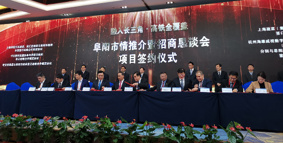 阜阳市副市长李红作重点项目、企业急需紧缺人才需求目录推介及招商、招才政策说明。现场还举行了签约仪式,37个政府园区合作、产学研合作、产业合作项目现场签约。中国建筑材料流通协会会长秦占学作为中环控股的战略合作方,代表双方单位,就中国建材(阜阳)国际展览交易中心及建材互联网集采供应链科技平台项目,与阜阳市政府上台签约。