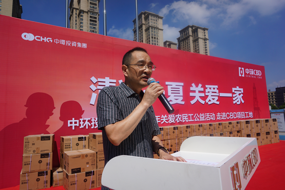 中建四局六公司党委书记李民代表建筑施工单位在讲话中表示,中建四局六公司自四年前搬迁合肥以来,一直与中环集团保持着良好的战略合作伙伴关系。为了确保中环CBD项目的顺利进行,中建四局六公司配备了优质的项目队伍和先进的生产设备,务必使得中环CBD成为合肥城市建设的标杆。同时,李书记表示,中环此次活动所表现出来的对农民工的关爱和保护,表现了企业的责任心与使命感,中建四局六公司为这样的一个合作伙伴感到骄傲和自豪。