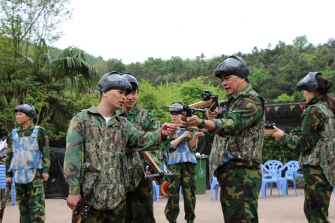 为了让大家能完全融入战士这一角色,教练先对大家进行分队、喊口号、搭肩按摩、捶背、敲敲头等热身运动,接着讲述了战地的情况和装备的使用方法。随后所有人换上迷彩服,分成防与守两队,在紫蓬山坡上玩起了真人CS。在刺激紧张的比赛中,大家学会了团队协作的重要性,认识到了群体的作用。