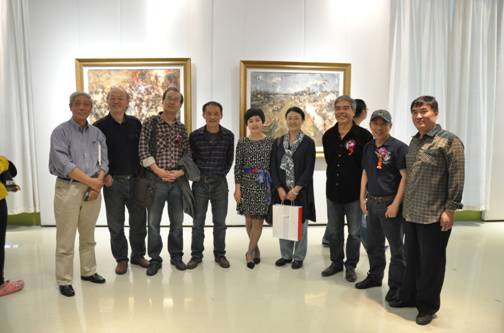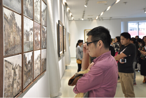 开幕式结束后,嘉宾们纷纷参观了本次画展。徜徉作品间,体会到艺术家在攀登艺术高峰中不懈的努力,每一幅作品都凝聚了心血。画面充满着巫俊先生对现实生活体验的热情,感受来自他内心深处的蜕变。从《跨越》到《变迁》,从《三峡大坝工地》到《大编组站》,一幅接一幅体现时代气息的鸿篇巨制横亘在观众面前,激情饱满,气势恢宏,展示出前所未有的视觉冲击和震撼力。在《黑白徽州》和《茅盾的故乡—乌镇》等表现江南古镇的风景画中,在这些纷乱的笔触中,突显了画家内心一份沉重和激越情怀。在《巴黎圣母院》中的沉厚的调性中,感受到那苍白的墙面,冷灰的房顶和暖灰的天空所构成的节奏感,犹如一曲低沉的交响乐章……在激越和厚重的笔触和肌理中看到了画家本真的性情。