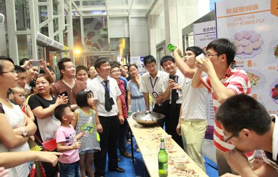 作为本场比赛压轴出场的男士组,自然是最大的看点。经常混迹于烧烤摊的男人们对于花甲可谓驾轻就熟,比赛开始后几分钟内就已经轻松的解决。为了增加比赛难度,男士组总决赛临时决定增加啤酒一瓶,一位看起来文文弱弱的男士以最快的速度最终获得了冠军。