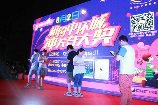 8月2日下午,虽然天气很炎热,但依然阻挡不了中环购物中心的人气,北广场人声鼎沸,超大型的舞台已经搭建完毕,路演活动预热气氛,来逛商场的情侣们纷纷玩起了体验活动,赢取免费赠饮,等待着情侣闯关活动的正式举行。
