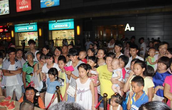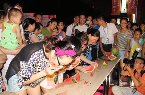 下午6时许,中环购物中心北广场人声鼎沸,聚集在喷泉附近纳凉休憩的人群移步“西瓜大胃王”比赛现场,纷纷登记准备即将进行的比赛,活动现场人气集聚,被围得水泄不通。