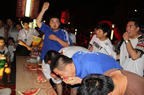 接下来成人组的比赛中,战况异常激烈,男生队队员们为确保能在最短的时间内吃完,各位精英壮汉纷纷使出浑身解数,拼命的将西瓜塞进嘴里。女生队更是令人刮目相看,优雅的形象早已抛诸脑后,这个时候,只有胜利才是最重要的事情。