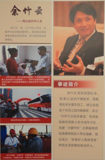 为培育和践行社会主义核心价值观,让全省群众直观感受、直接浸染好人模范的崇高品质,3月31日,由安徽省委宣传部、省文明办、省文化厅、安徽博物院共同打造的全国第一家省级“好人馆”——“安徽好人馆”在安徽博物院老馆建成并开放。2011年荣登“中国好人榜”,被评为全国“助人为乐”好人的中环集团董事长余竹云,入列“安徽好人馆”。